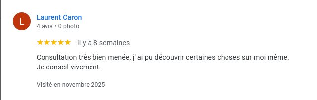 Laurent CaronTrustindex vérifie que la source originale de l'avis est Google. Consultation très bien menée, j' ai pu découvrir certaines choses sur moi même. Je conseil vivement. christine donnartTrustindex vérifie que la source originale de l'avis est Google. Je suis très contente de ma séance, j’ai trouvé des réponses à mes questionnement. BACHA JulienTrustindex vérifie que la source originale de l'avis est Google. Mélanie est très a l'écoute et de très bon conseil. elle m'a permis de me libérer de mes doutes et depuis j'avance. je recommande vivement. mr goncalves Anne Cécile GAUVINTrustindex vérifie que la source originale de l'avis est Google. Melanie capte très bien les blocages, pour cibler ce qu’on doit travailler. Première partie d’échanges puis un soin guidé, je recommande annick flahautTrustindex vérifie que la source originale de l'avis est Google. Je retrouve de bonnes nuits et de l énergie Je recommande les soins de Mélanie qui est très à l écoute. Tassadit IkhlefTrustindex vérifie que la source originale de l'avis est Google. J.ai passé un bon moment je vais suivre vos conseils et je vous tiendrai au courant merci pour vos conseils Nathalie BourveauTrustindex vérifie que la source originale de l'avis est Google. Je me. Suis trouve plus came j ai été très fatiguée j ai aimer. La séance très bien sa m'a fait Du bien Katel de BreizhTrustindex vérifie que la source originale de l'avis est Google. J'ai passé un moment magique, hors du temps avec Mélanie. J'ai ressenti des émotions diverses, agréables ou pas, qui m'ont mise les larmes aux yeux. En revanche, après la séance je suis rentrée chez moi avec un grand sourire aux lèvres et un sensation d'optimisme dont j'avais bien besoin. Je recommande ce soin sans hésiter Sk SkTrustindex vérifie que la source originale de l'avis est Google. Prestation à la hauteur de mes attentes. L'adresse est très facile à trouver et Mme Julien très agréable à écouter pour ses conseils. Adele HuguesTrustindex vérifie que la source originale de l'avis est Google. Merci pour ce moment très pertinent et constructif